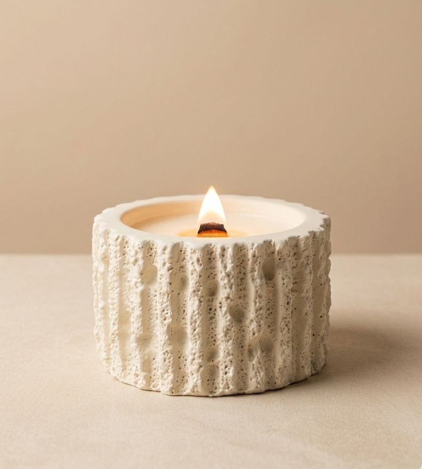 Transform your living space with this distinctive stone-textured candle featuring a unique cylindrical design. The elegant cream-colored exterior showcases a textured, organic pattern reminiscent of natural stone formations, while dual wooden wicks provide a warm, gentle flame. This sophisticated decorative piece combines functionality with artisanal craftsmanship, creating a serene atmosphere perfect for relaxation and mindful moments.