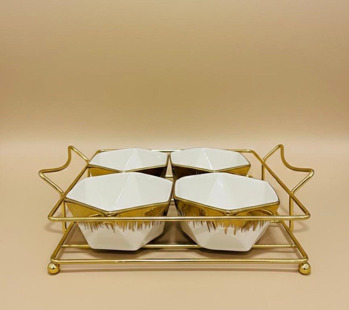 Elevated Golden Stand: The four bowls sit in a sturdy, architectural gold wire rack that raises them off the table for an elegant presentation.