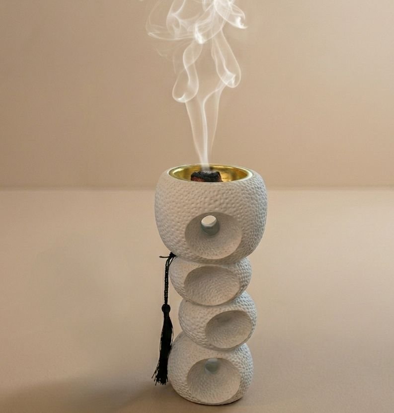 The Burner 4 is a contemporary mini incense burner featuring a distinctive sculptural design with stacked circular elements and a textured white exterior. Its compact size makes it perfect for desks, cars, or travel bags, while the elegant gold-lined interior adds a touch of luxury. This stylish yet practical burner combines modern aesthetics with functionality, creating an instant ambiance upgrade wherever it’s placed.