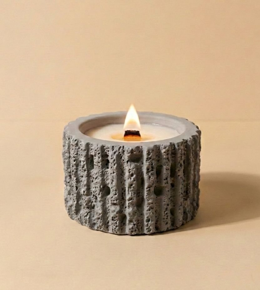 Transform your living space with this distinctive stone-textured candle featuring dual natural wooden wicks. The cylindrical design showcases a unique textured exterior with vertical ridges that resemble natural stone formations, creating an elegant contrast with the smooth interior that houses the warm flame. Perfect for creating a serene ambiance, this artisanal candle combines rustic charm with contemporary design to enhance your home décor while providing a soothing, flickering glow.
