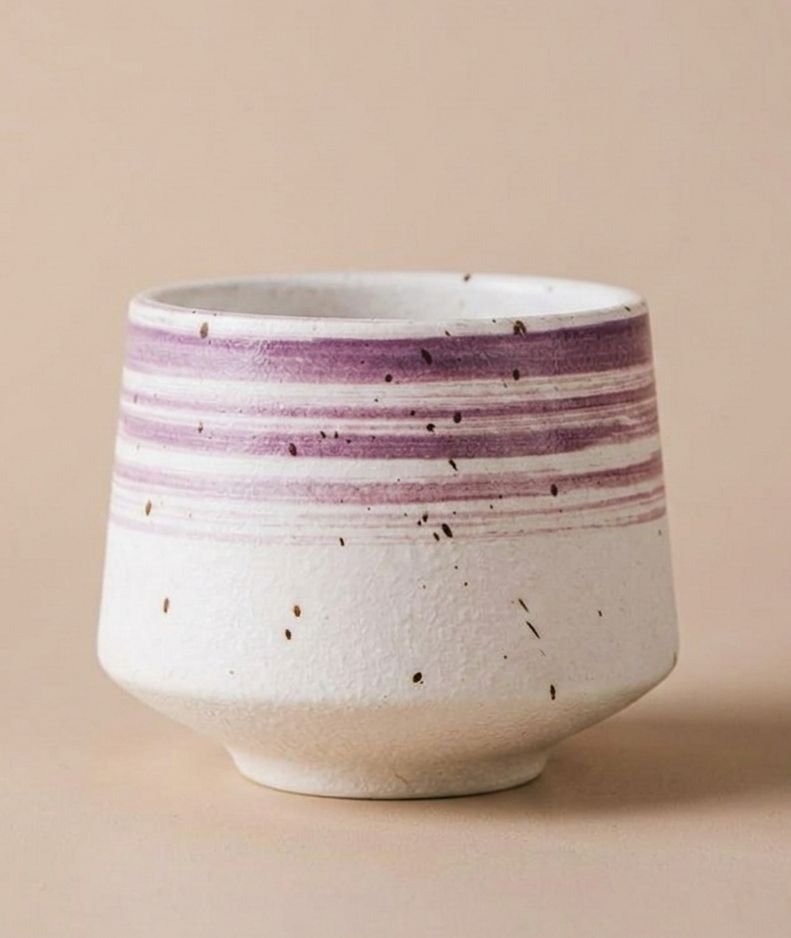 A handcrafted ceramic coffee cup featuring a two-tone design with a white base and delicate purple striped pattern at the rim. This elegant piece combines modern aesthetics with traditional craftsmanship for an authentic coffee-drinking experience.