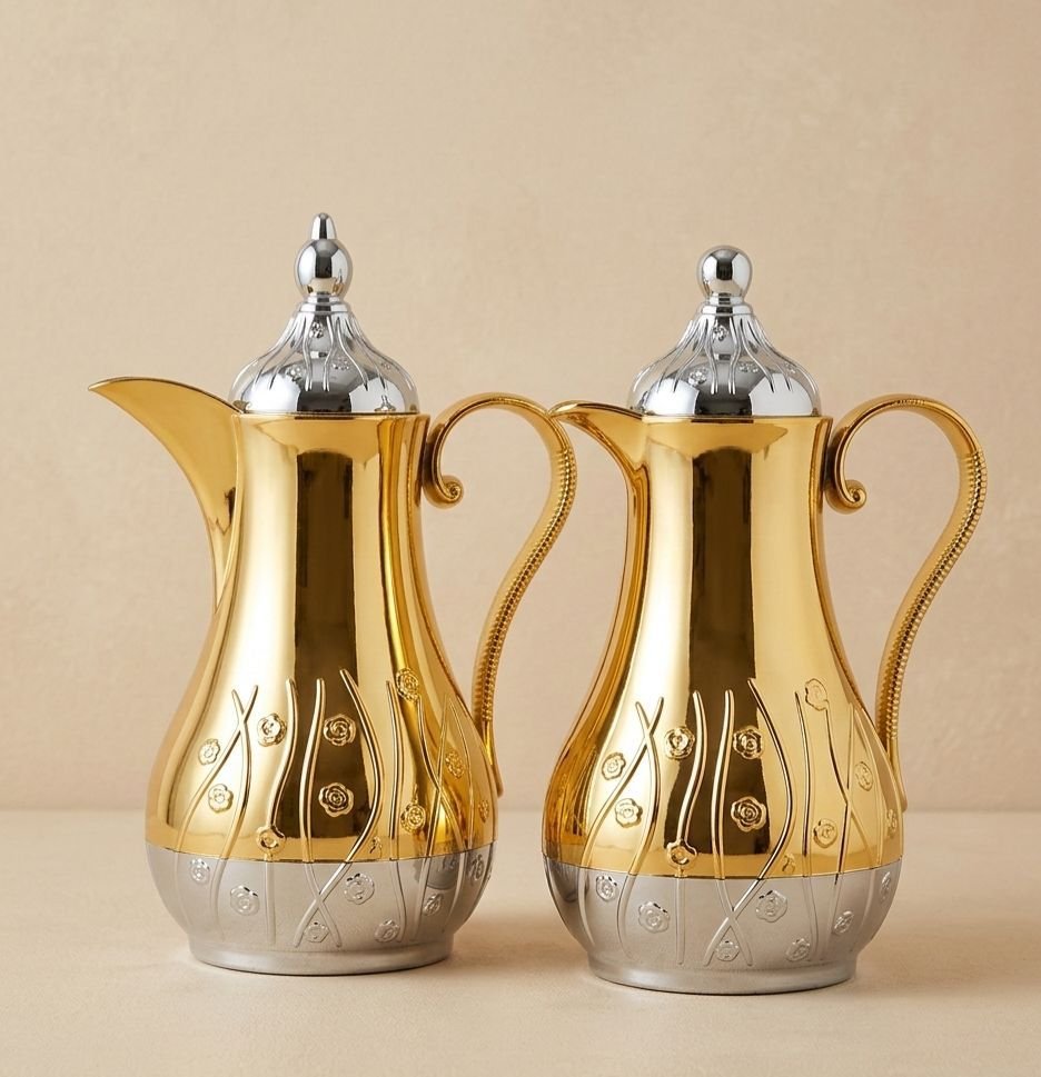 Add timeless elegance to your coffee and tea service with this beautifully designed Gold and Silver Thermos Set. Featuring a stunning two-tone design with a lustrous gold upper body and polished silver base, each carafe is detailed with delicate floral engravings that create a refined and sophisticated look. The curved spouts, graceful handles, and silver dome-shaped lids with decorative finials complete the elegant design.