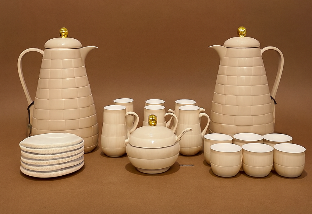 Transform your tea and coffee service into a grand occasion with this all-inclusive 21-piece set, featuring a sophisticated embossed brick pattern finished with elegant gold accents.