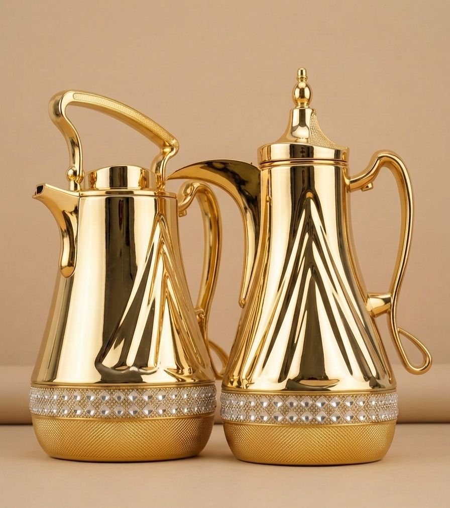 Bring elegance and sophistication to your coffee and tea service with this Luxury Studded Golden Thermos Set. Designed with a brilliant gold-tone finish and sparkling crystal-studded bands, these thermal carafes create a striking and luxurious presentation. The vertical ribbed detailing adds texture and depth, while the ornate spouts and gracefully curved handles enhance both style and functionality.