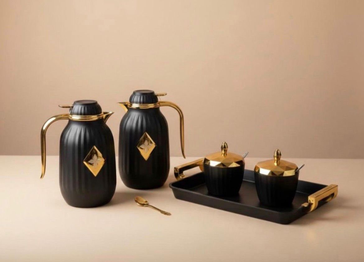 Complete 5-Piece Set: Includes two high-quality insulated flasks, two matching pots for sugar or dates (with spoons), and a coordinated serving tray.