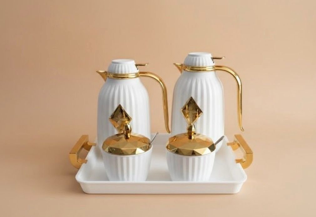• Complete 5-Piece Set: Includes two high-quality insulated flasks, two matching pots for sugar or dates (with spoons), and a coordinated serving tray.