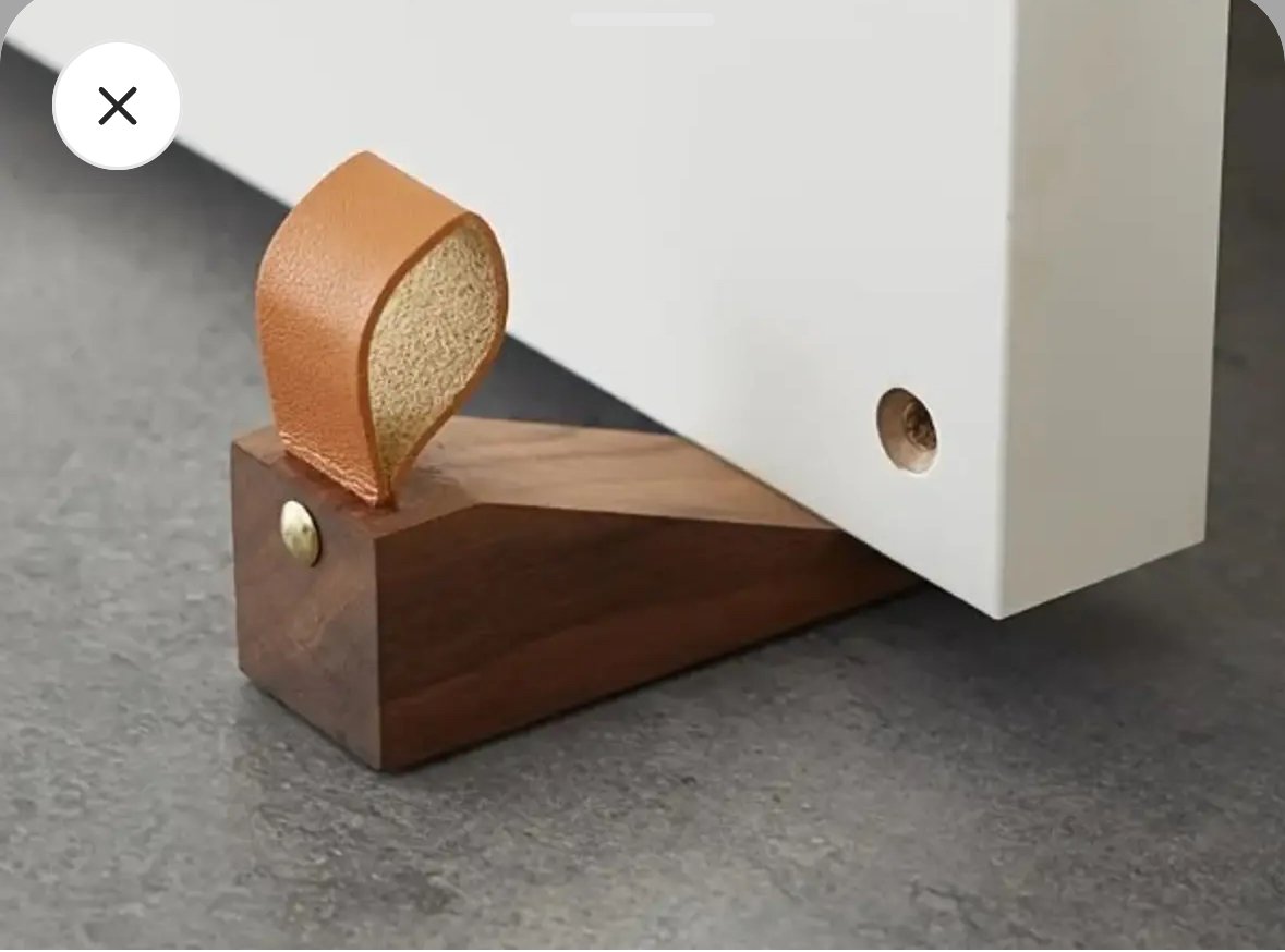 This elegant door stopper combines solid-wood construction with a leather-accented strap, offering both functionality and aesthetic appeal. The wedge-shaped design effectively holds doors in place while adding a sophisticated touch to any room.