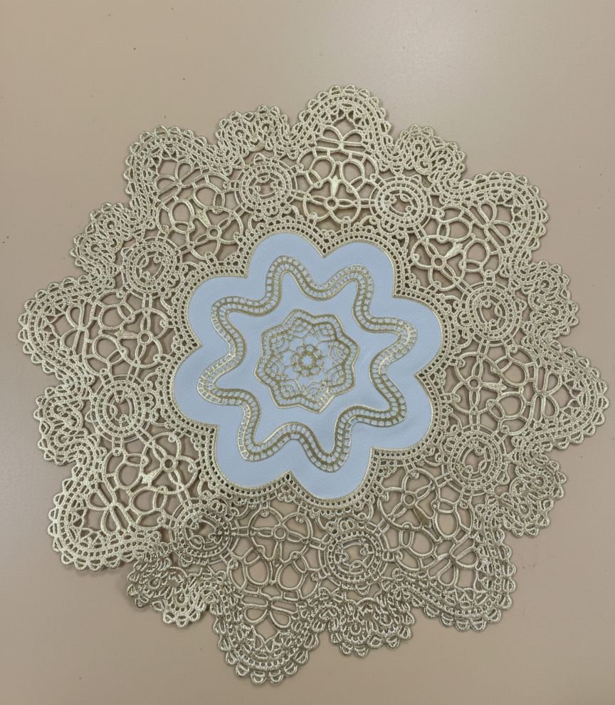 Add a touch of luxury to your home with this beautiful, metallic gold lace doily. It features a delicate, intricate pattern that looks stunning under vases, lamps, or on its own.