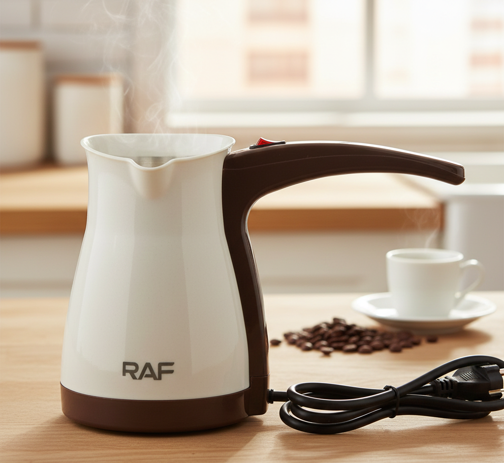 Aesthetically pleasing and highly functional, the RAF Electric Turkish Coffee Maker features a minimalist design without compromising performance. Its clean lines and contemporary blend of white and brown make it a versatile addition to kitchens of all styles. Unlike bulky appliances, its compact profile ensures it doesn’t dominate your counter space. Whether you’re preparing your morning brew or treating guests to authentic Turkish coffee, this stylish coffee maker delivers both quality and presentation for an elevated brewing experience.