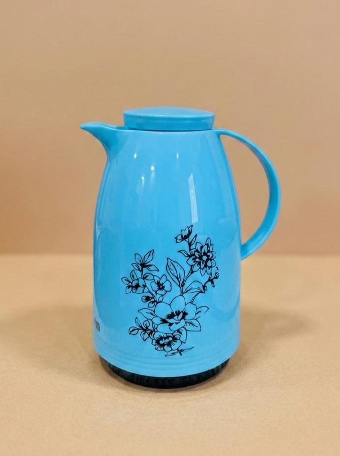 A stylish vacuum flask featuring a vibrant blue finish with elegant floral detailing that adds a decorative touch to its classic design. Built to maintain the temperature of beverages for longer periods, this flask is perfect for serving tea, coffee, or other hot drinks at home, in the office, or during gatherings.